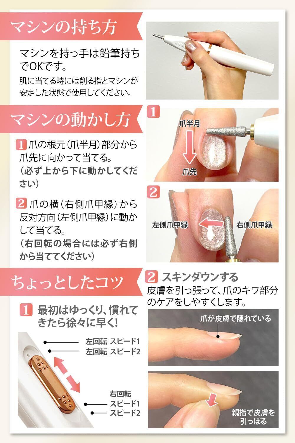 プロ用のネイルマシンは25000rpm回転とかなりのパワーがあります。素早くオフが出来るメリットありますが、初心者は扱いにくく使い方によってはかなり危険です。