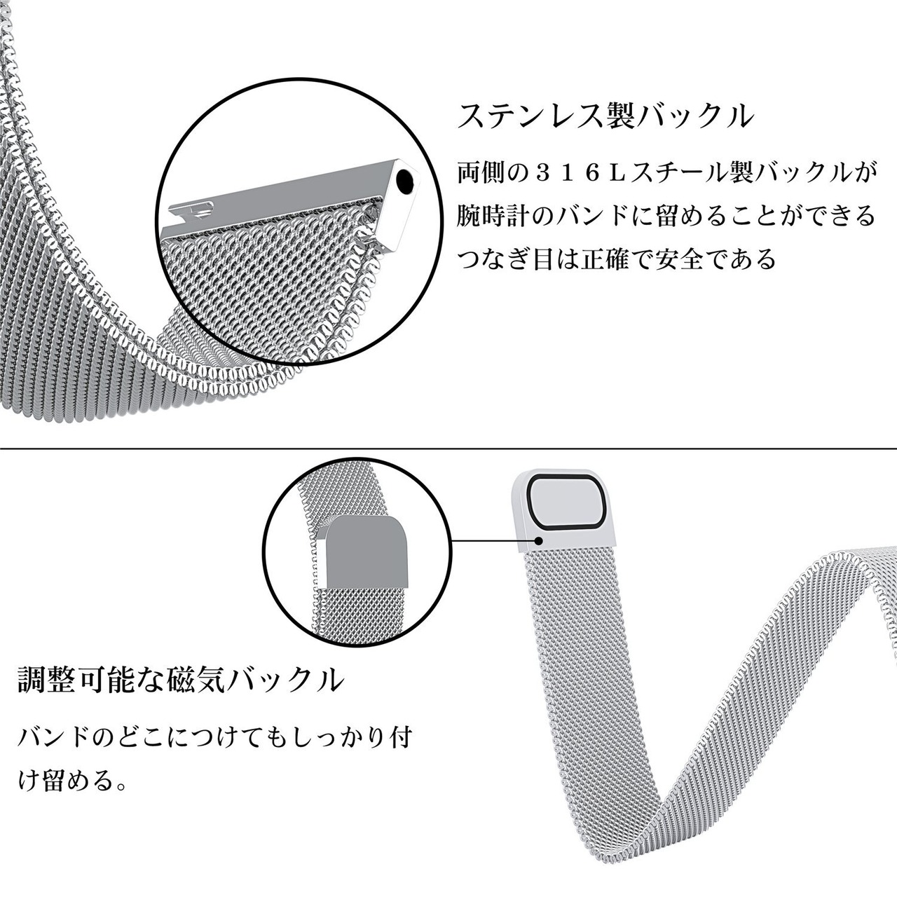 時計バンド ウォッチベルト マグネット式腕時計バンド スマート時計バンド 幅 18mm 20mm 22mm 交換ベルト メッシュバンド ミラネーゼバンド (20mm, シルバー)