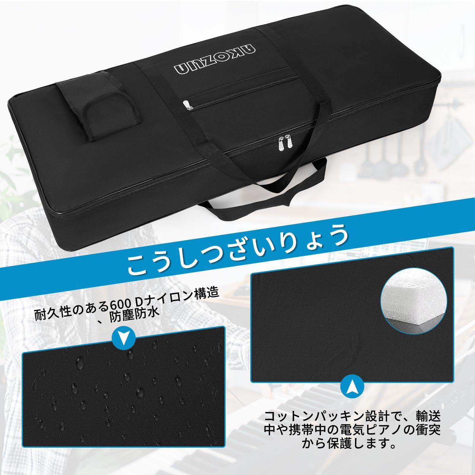 ??【600D防水防塵生地】お気に入りの楽器を保護するために、キーボードギグバッグは防水性と耐傷性素材を採用しており、キーボードが衝突や傷を避け、濡れを防ぎます。 耐久性のある構造のおかげで、ピアノキーボードケースはキーボードを乾燥した状態に保ち、ほこりから守ることがされています。 超軽量のソリューションにより、61鍵キーボード バッグは持ち運び、ギグ、旅行に持ち運びが可能です。