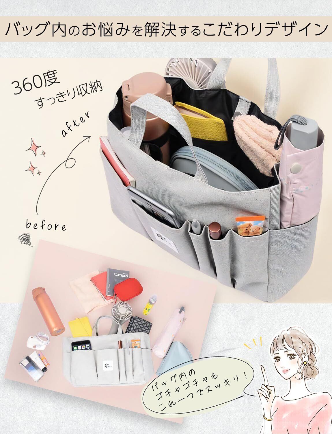 【新着商品】バッグインバッグ a4 軽量 大きめ 【360度収納できて便利】 バックインバック トートバッグ用 自立 インナーバッグ 横型 整理 収納