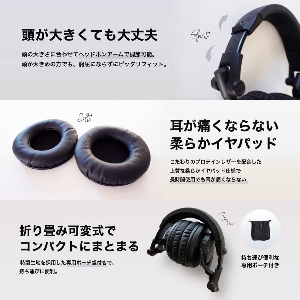 ?【 耳が痛くならないイヤパッドに持ち運び便利なポーチ袋付き 】プロテインレザー生地を採用した柔らかイヤパッドは手触り滑らかで両耳へ心地良いフィット感をもたらします。固くない為、長編映画の動画視聴や長時間に渡るオンラインミーティング、長時間のDTM作曲作業の際の負担軽減を実現しています。また本体は折り畳み可能です。着脱式ケーブルをヘッドホン本体から外してコンパクトに折り畳んでREFION特製ポーチ袋に収納可能。置き場所や持ち運びにも困ることはありません。