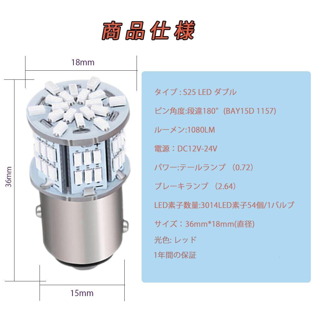 【形状】S25_180°(ダブル)、【光色】1000k-200K(レッド/赤)、【対応電圧】DC12V/24V、【LED】3014SMD、【商品内容】LEDバルブ 2球