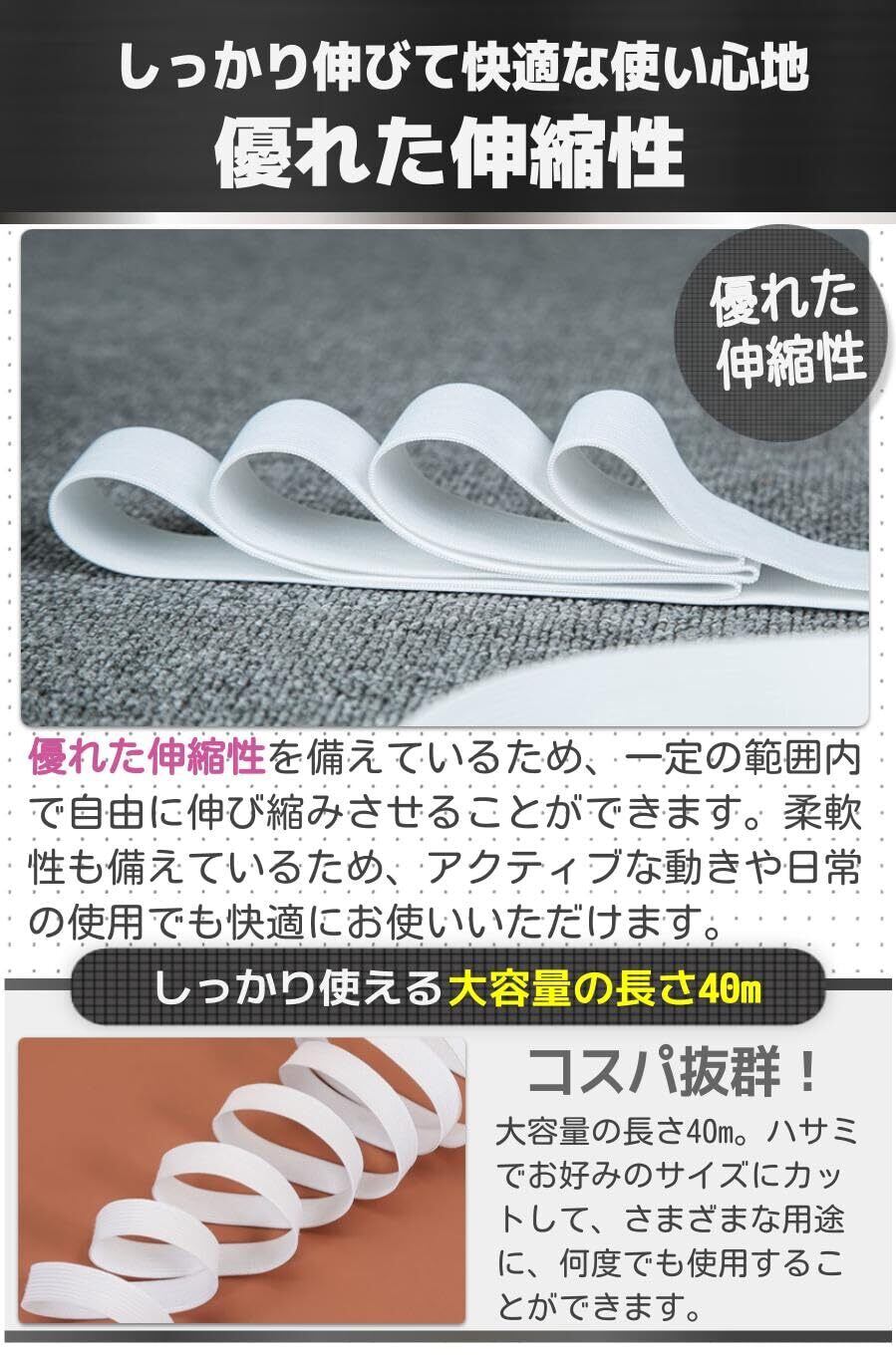 【商品特徴】①厚みのある素材 :丈夫な作りで摩擦や乾燥に強い /②繊細な編み目 :細かい編み目で肌触りも滑らか /③幅広い使用範囲 :衣類やバック、帽子など幅広く使える /④4つのサイズ展開 :目的や用途に応じてゴム幅が選べる【商品詳細】セット:1個素材:ポリエステル/サイズ:長さ 40m/幅1.5cm/2cm/2.5cm/3cm/