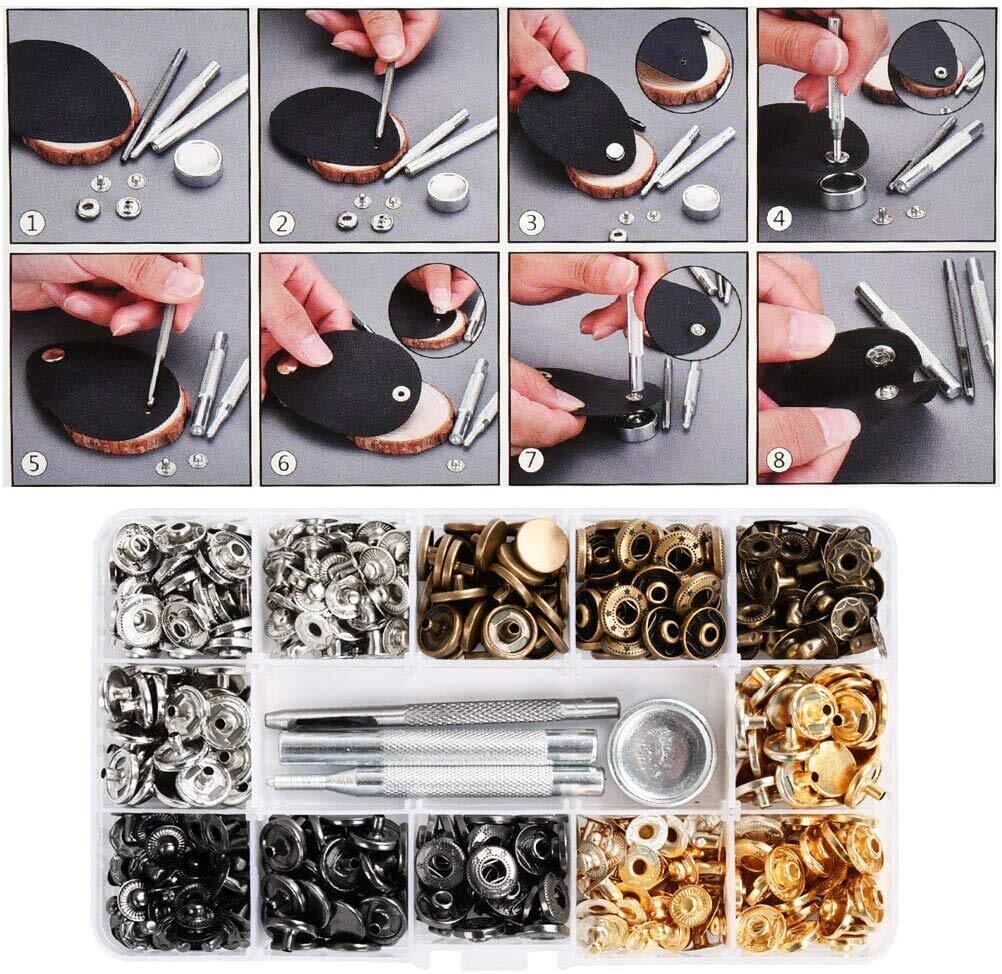【DIY・手芸・ハンドメイドに適用】:皮革を素材に用いて工芸をすることで、時間を楽しんだり、革製品を作ったりする不可欠の作業セットでレザークラフト・ハンドメイドに適用します。かばん、財布、キーケース、パスケース、服、ジンーズ、レザーベルト、やアクセサリー、財布、キーケース、サンダル等様々な革製品にホックの取付作業に必須の工具としてお勧め。大活躍な手芸材料セット、素敵なハンドメイド作品の仕上げに大いに役立ち間違いありません。DIY好きな方にお勧めです。