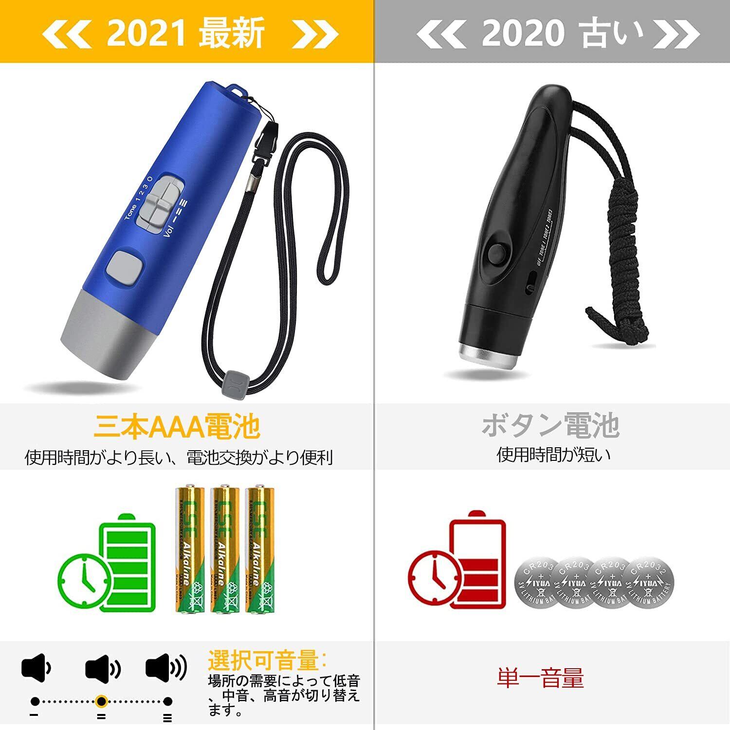 【3本AAA電池と収納袋付き】弊社の電子ホイッスルはAAA電池を3本付き、ボタン電池より長い寿命がある、電池交換もしやすいです。戸外運動にはとても便利です。収納袋付きで、持ち運びも楽々です。