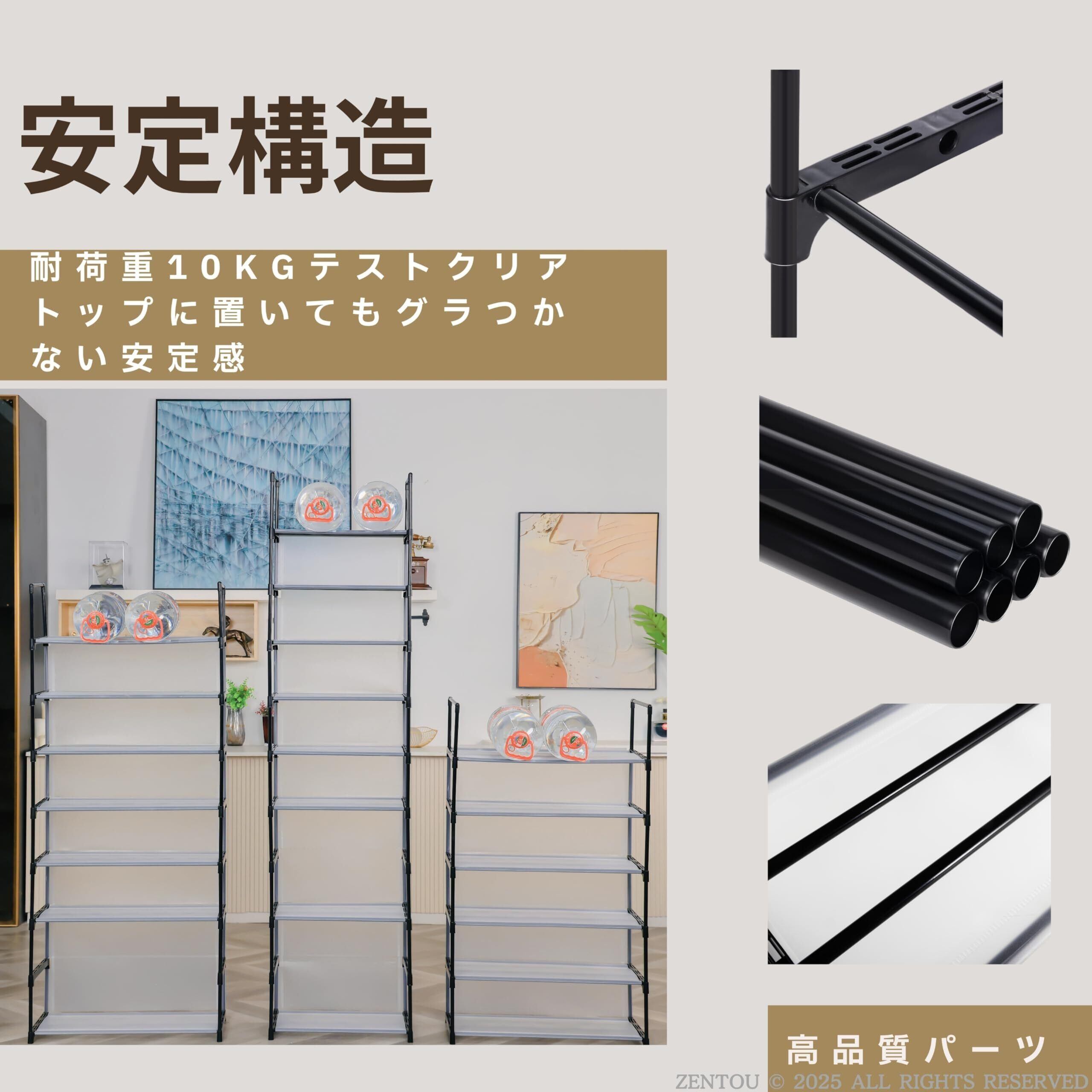 4. 高耐荷重・壁面保護に優れたシューズラック スチールパイプとPPシートでしっかり支え、高耐荷重を実現。靴収納だけでなく、本棚や雑貨収納としても使えるマルチシューズラックです。壁面接触部分にはPPシートを採用し、壁面を傷や汚れから保護します。靴箱やシューズラック おしゃれとしてもおすすめです。子供用靴箱や靴しゅうのう ラックとしても最適です。スリムシューズラックや靴箱 高さ調節可能としても使えます。