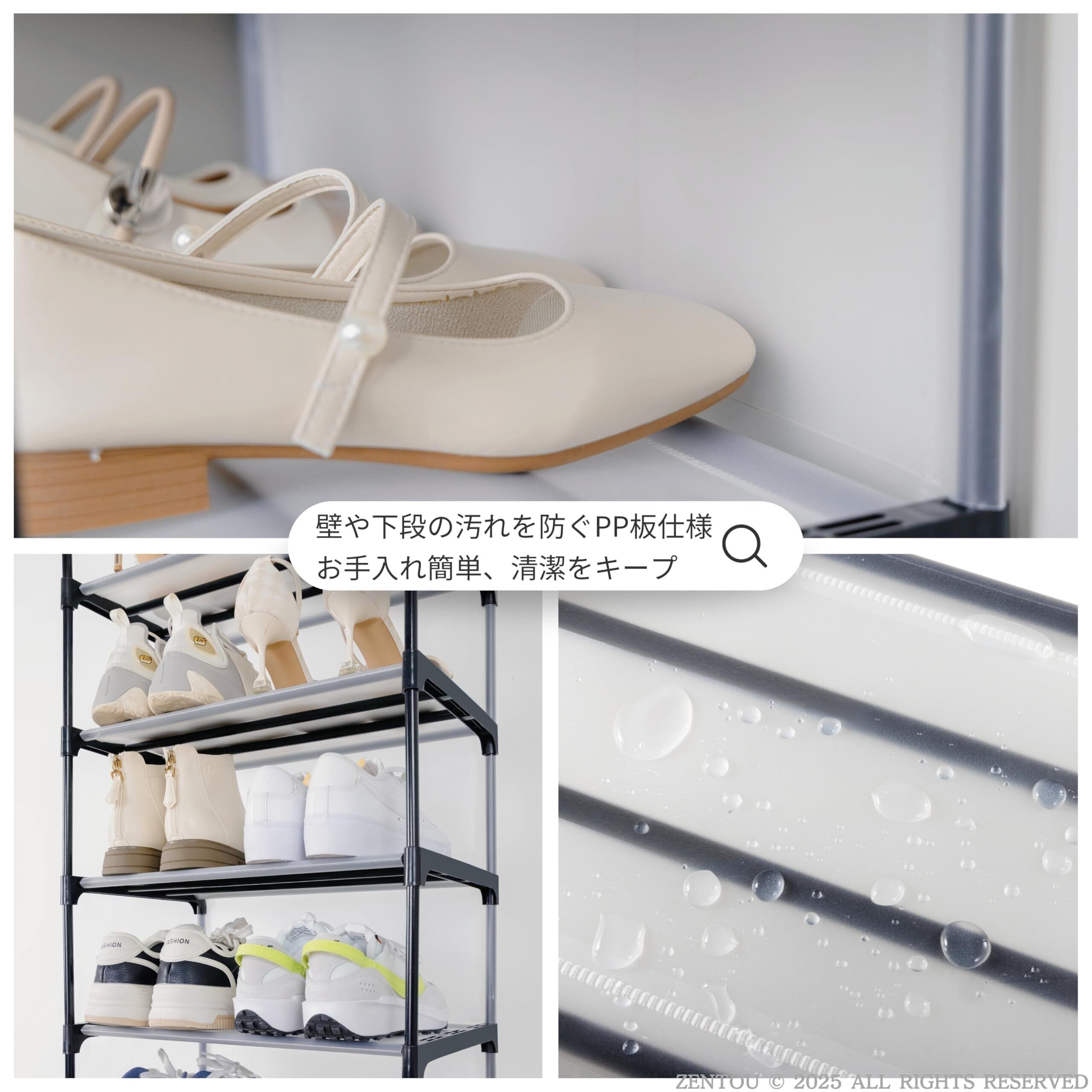 3. 簡単組立・工具不要のシューズラック スチールパイプ、PPジョイント、PPシートを使用し、工具不要で簡単に組み立てられます。女性一人でも付属の手袋で約10?20分で完成。何度でも分解・再組立ができ、模様替えや引っ越しにも便利です。靴しゅうのう 玄関、靴棚、靴箱 上収納、くつばこスリム 玄関、シューズ収納 大容量、省スペース 靴箱、シューズ ラックとしても活用可能です。