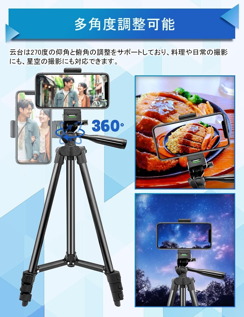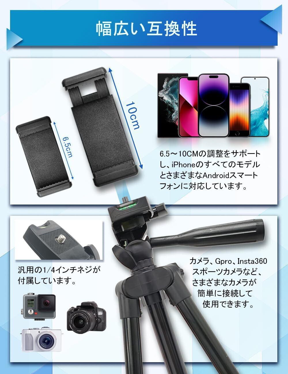 「多設備対応」三脚は1.5kgのカメラやスマホを設置可能 付属のスマホホルダーは展開サイズ6.5cm-10cmでサイズ4.7インチから6.7インチまでのアイホンやAndroidスマホをきっちり固定可能 三脚は3WAY雲台付きでカメラを360°自由に回転可能なので、より自然な角度を写真を取れる