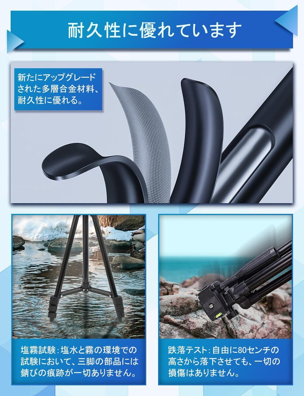 「品質」私たちは三脚のメーカで、6年以上の開発、製造経験を持ち、お客様によりいい製品やサービスを提供します。製品使用中問題が出る場合はいつでもお問い合わせください 私たちは誠実迅速に対応しますのでご安心ください