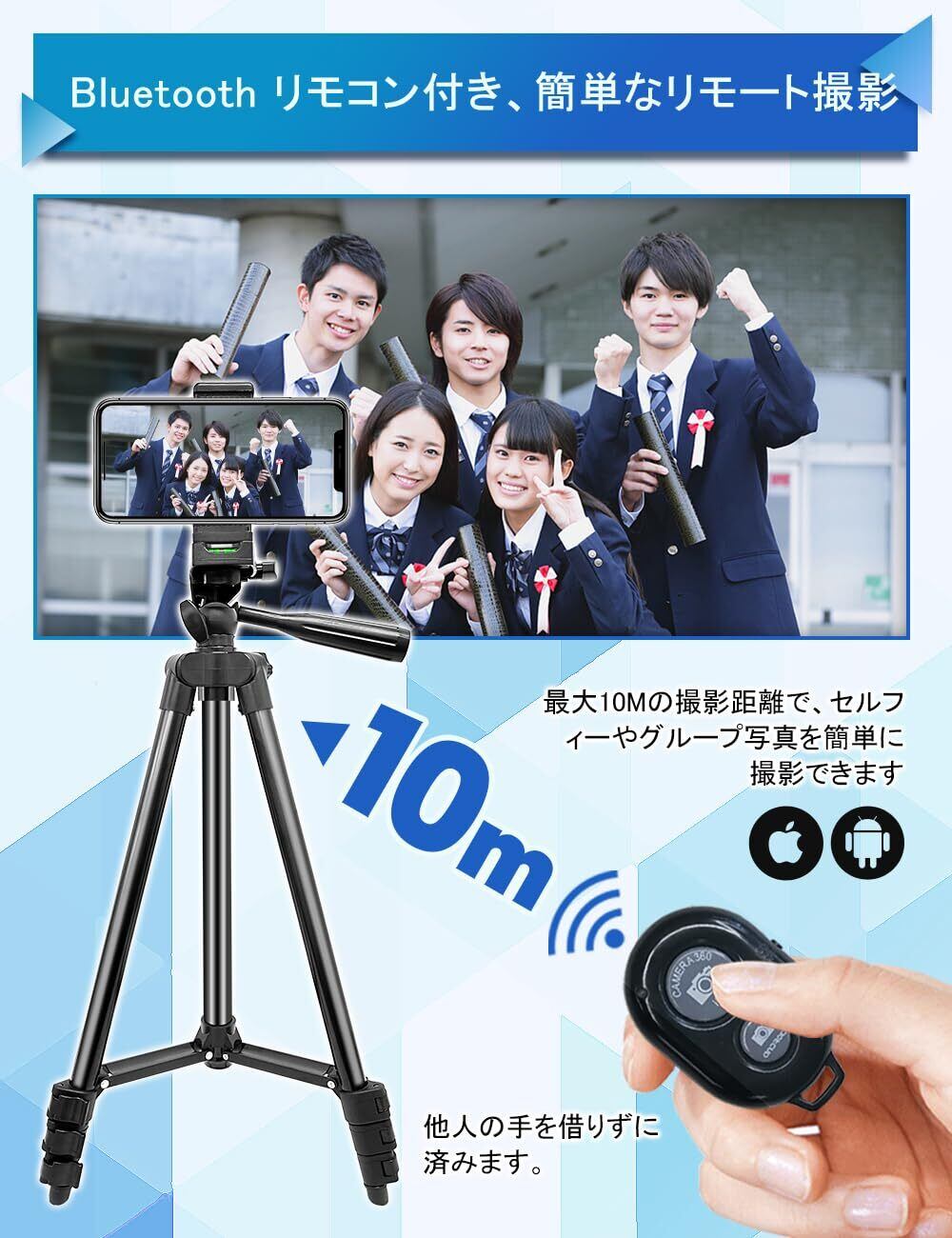 「Bluetoothリモコン付き」Bluetoothリモコンはカメラ/スマホに接続可能でアイホンやAndroidスマホに適用 シャッターを押すだけで最遠10mまで操作可能 Bluetoothリモコンで操作するのは撮影時の手振れを避けるだけでなく、他人からの協力なしで撮影を実現可能なので、とても便利
