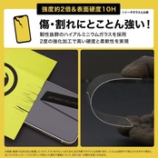 【貼るだけで約50% ブルーライトカット】貼るだけで簡単にブルーライト対策ができます。使用中の色味は透明タイプと変わりません。※屋外では紫外線の影響により画面が青みがかって見えます。屋外では画面を明るくしてご使用ください。 【傷・割れ防止】強靭なハイアルミニウムガラス素材を採用。強化加工で高硬度と柔軟性を実現しました。一般的なソーダライムガラスと比べ強度は約2倍、表面硬度10Hで画面を傷や割れから守ります。 【自己吸着・気泡防止】 画面にガラスフィルムを乗せるだけで自動的に空気が抜けていきます。