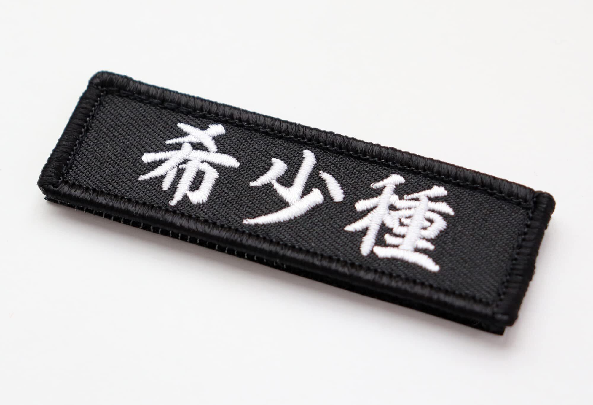「希少種」の文字をデザインした刺繍ワッペン!サイズは横8cm×縦2.5cm。