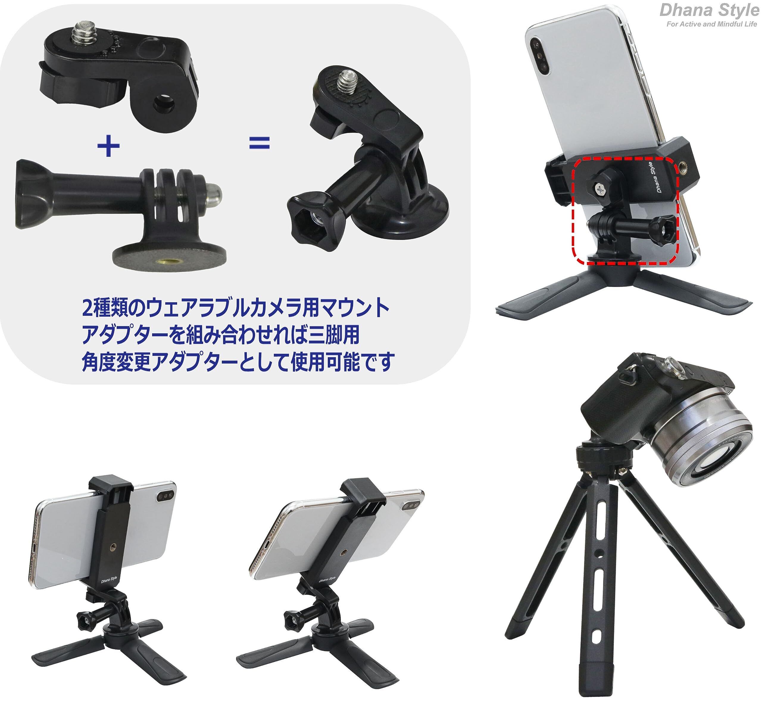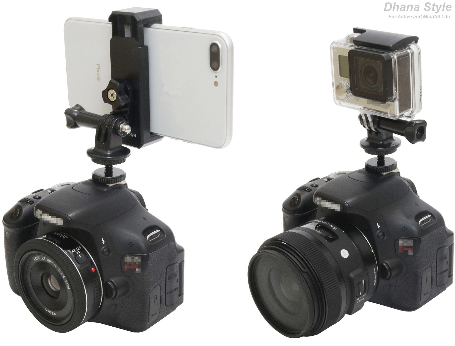デジタルカメラのホットシュー取り付け可能 アダプター (シュー マウント 対応アダプタ) と スマートフォン ホルダー・ウェアラブルカメラ GP規格 アダプターのセット商品です。iPhone シリーズやアンドロイド機種のスマホ、携帯電話、及びゴープロ Hero シリーズ , MUSON , DJI Osmo Action, SJCAM , AKASO, Vemico, Campark, Wimius, EKEN, APEMAN, GOOKAM, Surfola, COOAU, Vikyfly, Apexcam, Insta360, Crosstour, LeadEdge, DragonTouch, XTU, GitUp などのGoPro規格マウント(GP規格)のアクションカムに対応します。DSLR・一眼レフやミラーレス デジカメで写真撮影をしながらスマホやアクションカメラで同時に動画撮影をしたり、WIFI搭載の一眼レフでは撮影した画像や映像をスマホでその場でチェックしたりトリミング編集したりする事も出来るようになります。軽量で軽量・コンパクトで持ち運びや保管も便利です。