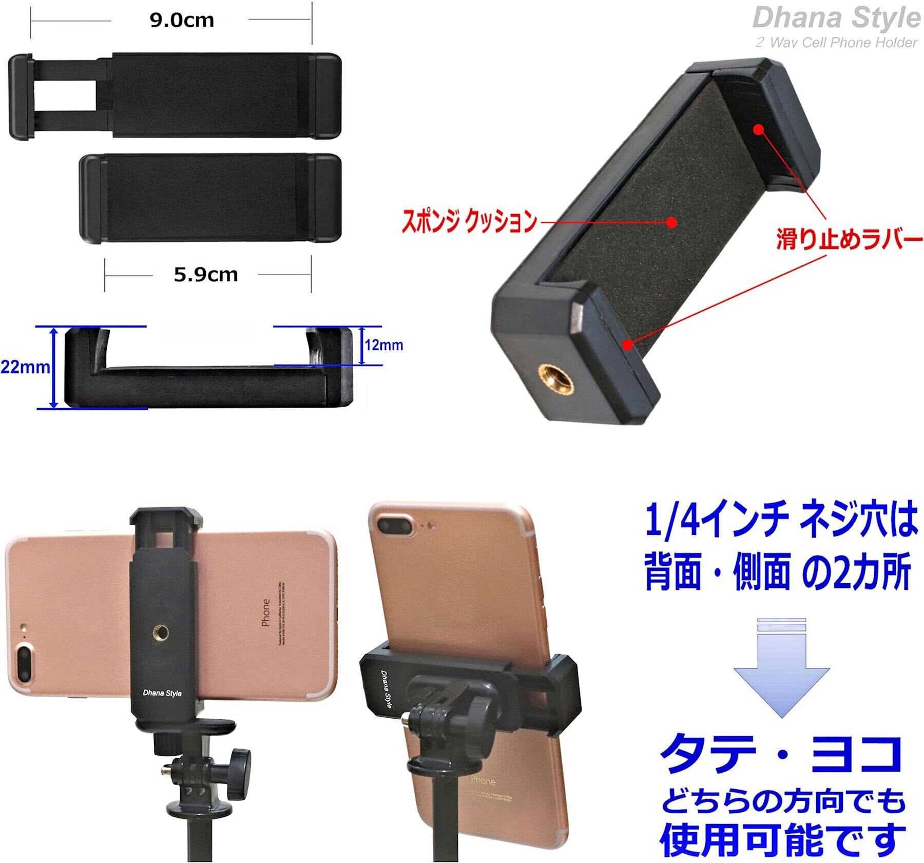 【スマホホルダー仕様】クリップ式で簡単に装着できるタイプ、 ネジ穴径;1/4インチ(カメラ用アクセサリー類汎用のサイズで性側面と背面の2か所にありお好みのアングルに応じて2Wayで使い分けが出来ます) 重さ;約25g 材質;プラスチック 対応する スマホ幅; 約62?90mm(iPhone XS, XS Max, XR, X, iPhone 8, 8plus, 7, 7plus, 6, 6plus, Samsung Galaxy S6 S5 S4 S3 Note 4 Note 3,等対応可) *4インチ幅のモデルには対応いたしません (iPhone4, iPhone5, 5S, iPhone SE 等 は対応不可) ---> ご使用のスマホ幅をお確かめ上ご購入下さい 。