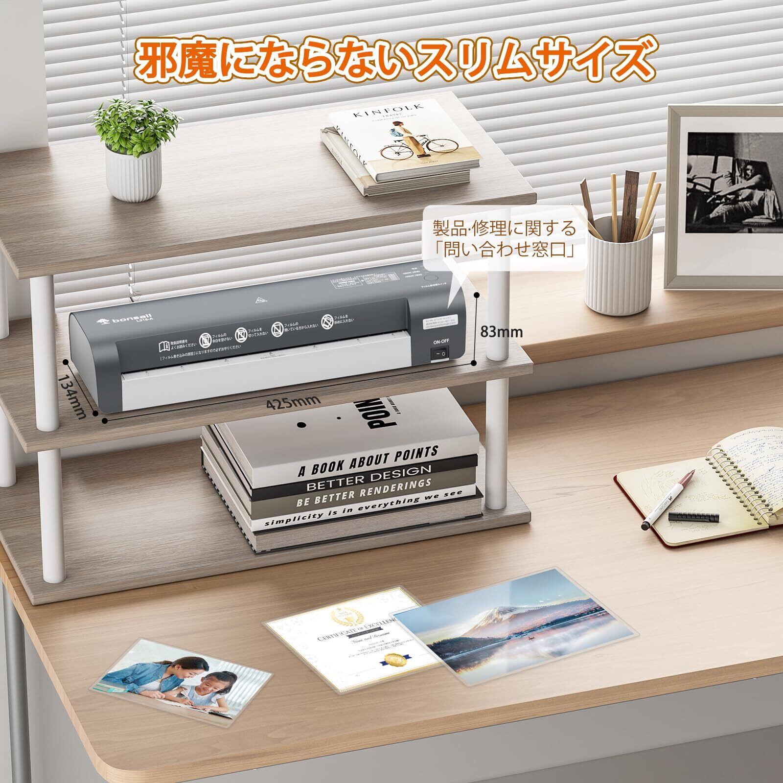 【A3対応なのにコンパクト】場所を選ばず使える!最大A3サイズまで対応するラミネート機械ながら、コンパクト設計で収納もラクラク。名刺、メニュー、手作り絵、書類など、さまざまなサイズに対応します。※サイズ:425L×134W×83H(mm)