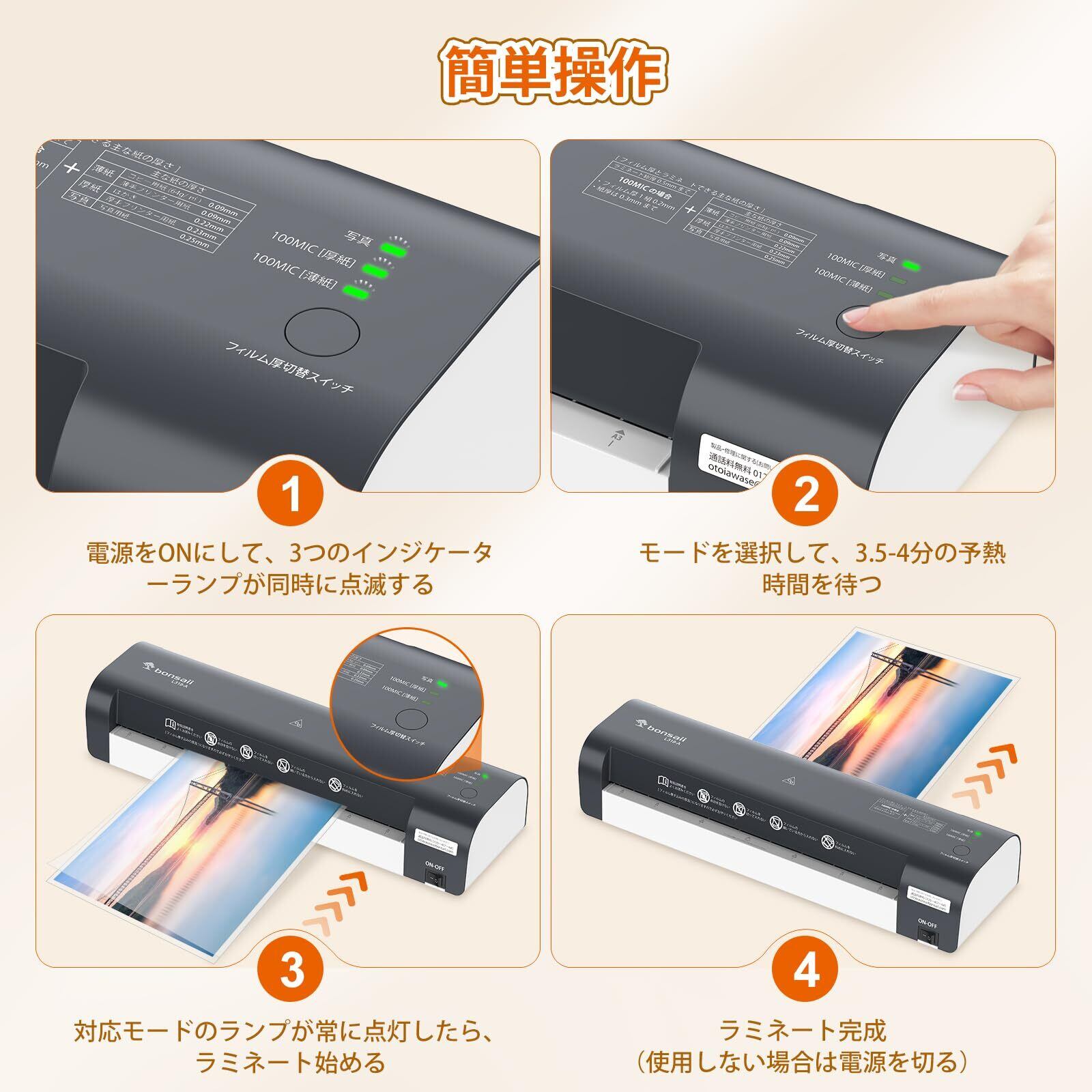 bonsaii ラミネーター a3 三つモード搭載 5枚A4フイルム付き 100%紙詰まり防止 名刺~A3サイズまで対応 ウォームアップ時間3.5-4分 波打ち防止 気泡なし 100μmフィルム対応 ラミネート機械 静音 業務用 コンパクト L318-A