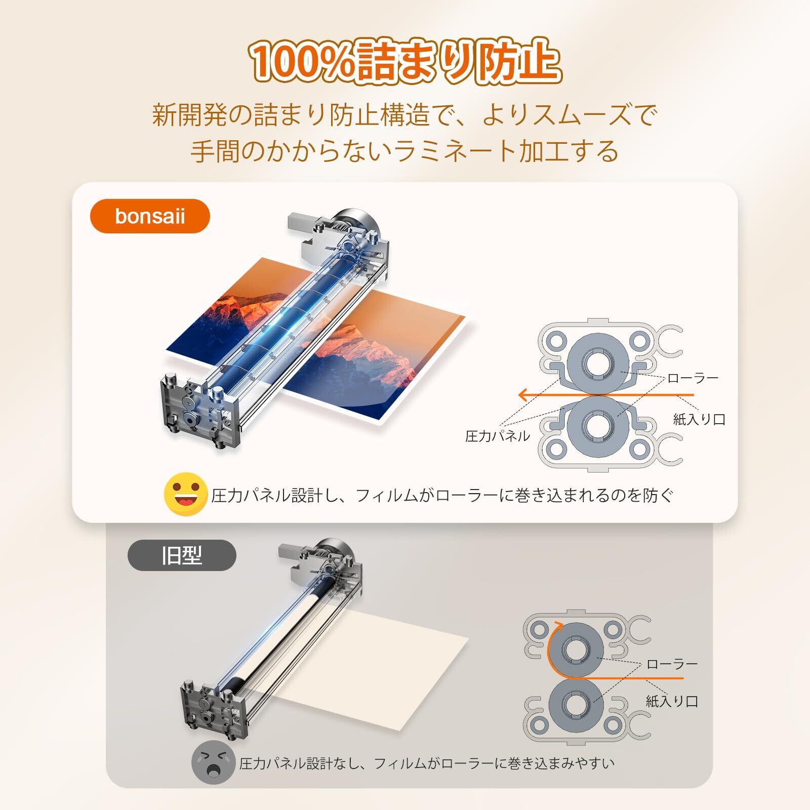 【ABS機能付き】安心の詰まり防止!万が一詰まっても、「ラミネート停止ボタン」で簡単に原稿を取り出せます。故障リスクを大幅に低減し、bonsaiiラミネーターを安心してご利用いただけます。※商品にご満足いただけない場合は、お気軽にお問い合わせください。