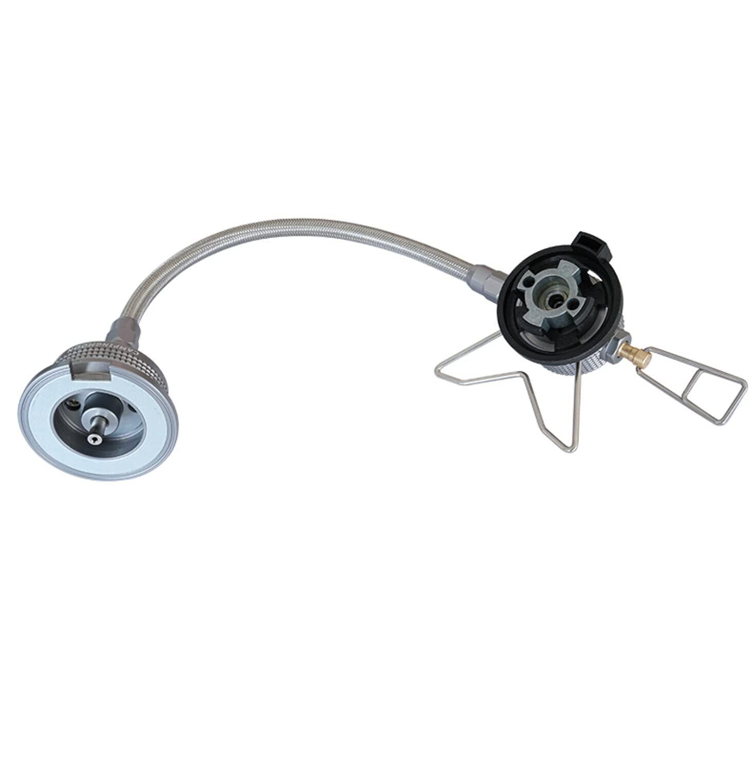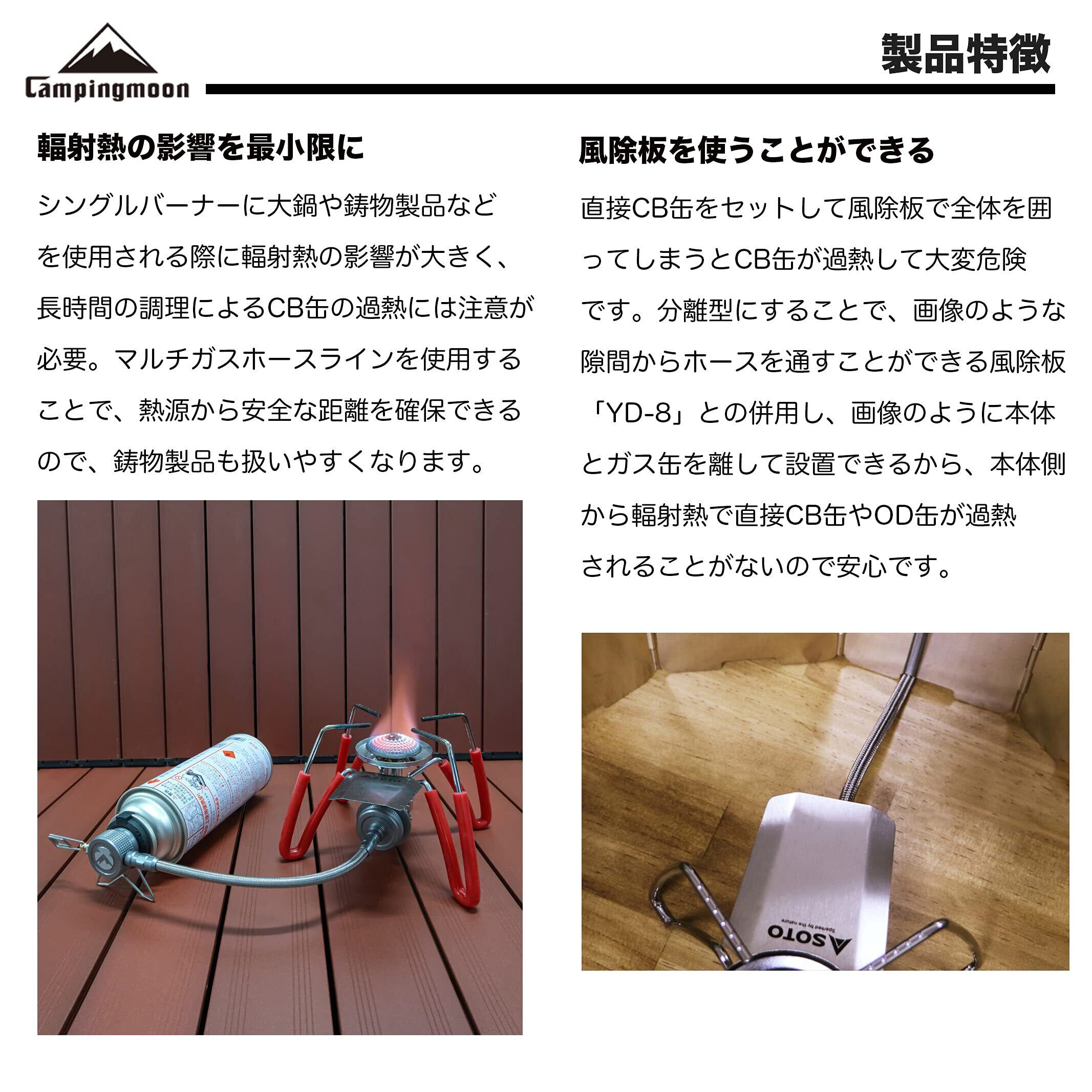 特徴:①シングルバーナー用、②バルプ式のマルチホースでガス流量の調整が可能、③CB缶→CB缶ガス器具の口金変換・延長