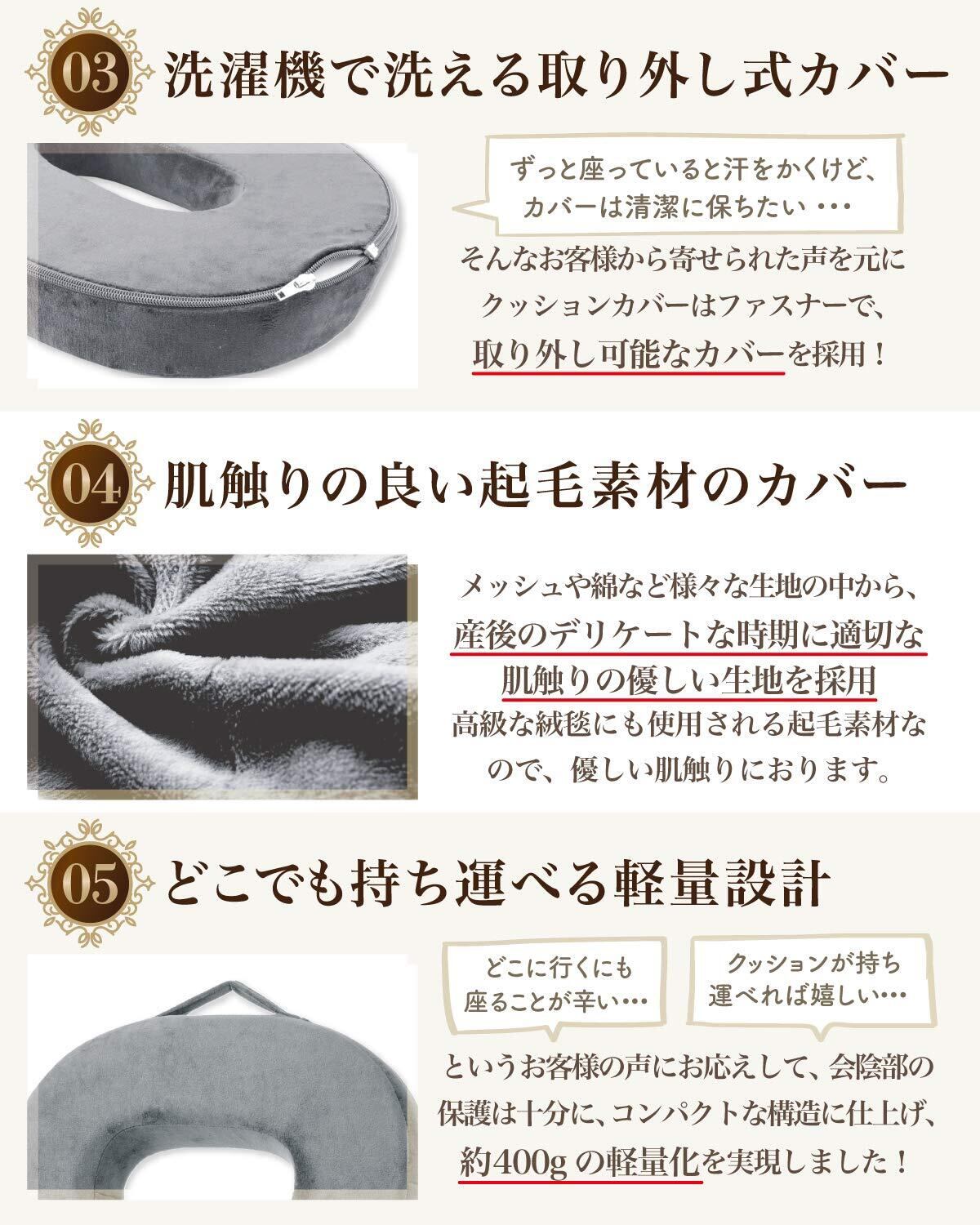 【産後ママのために!】出産時に発生する切開傷、痔など座ることが辛い…という方に向けて作られた”円座クッション”です。会陰部~お尻にかけて座った時に地面に触れないようにドーナツ型 (楕円型) の設計で開発されたクッションです。出産後のトラブルに詳しい【助産師&看護師の先生】にアドバイスをもらい、少しでも楽に座れるようにという思いが込められています。