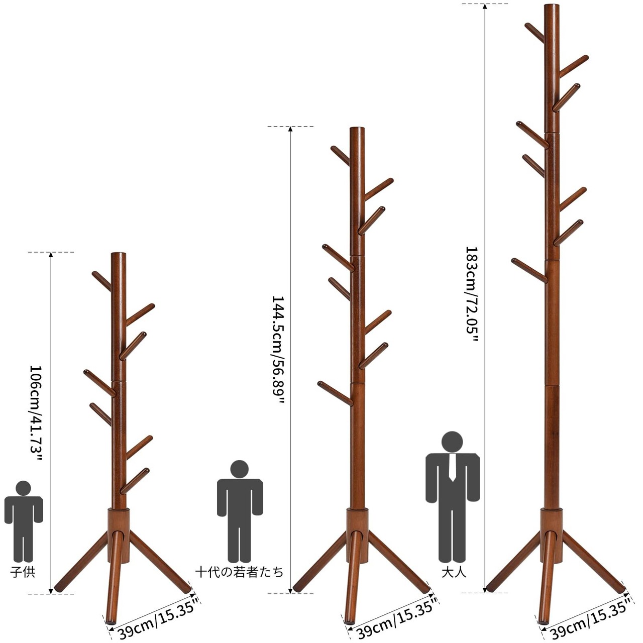 IBUYKE ポールハンガー おしゃれ コンパクト 衣類収納 木製 コートハンガー 落ちにくい 倒れにくい キッズポールハンガーへ変更可能 枝型フック設計 高さ183cm 組立て簡単 コーヒー JPRF-1195