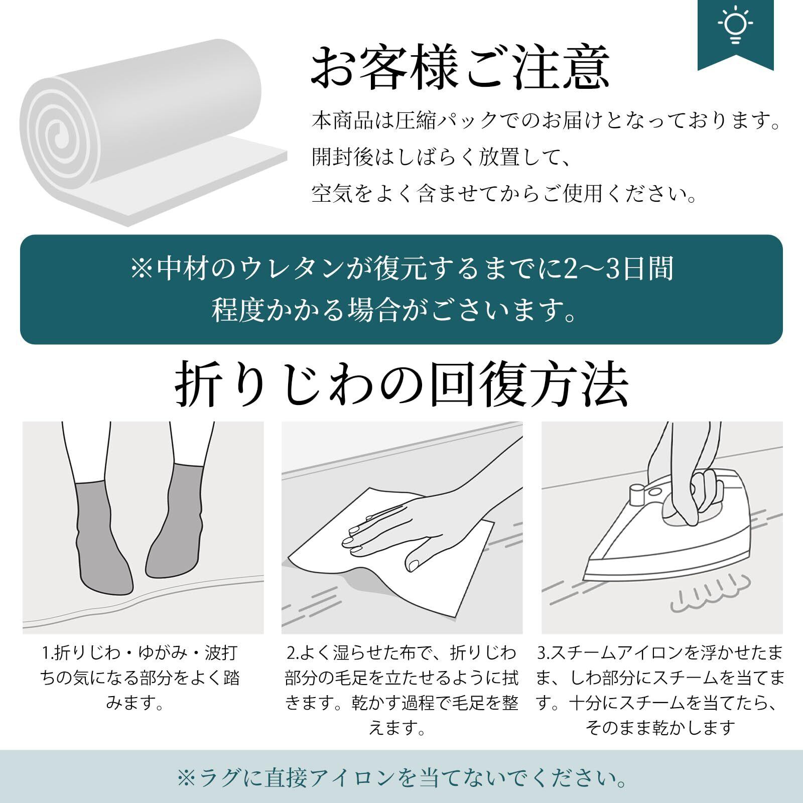 【ラグ仕様・お客様ご注意】サイズ:135×185cm 表地:ポリエステル100% 中材:ウレタンフォーム約6mm 裏面:不織布(滑り止め加工) 合計厚さ約10mmです。商品輸送の際に折りたたんでお届けするため、開封時に折りジワ、歪み・寸法不足等の変形がありますが、ラグマットを広げて一週間ほどご使用になれば、ゆっくりと回復します。光源が異なると、カーペットの色は少し違うように見えます。万が一商品に不具合がある場合、商品自体の問題がある場合は、弊社にご連絡いただければ迅速に対応いたします。