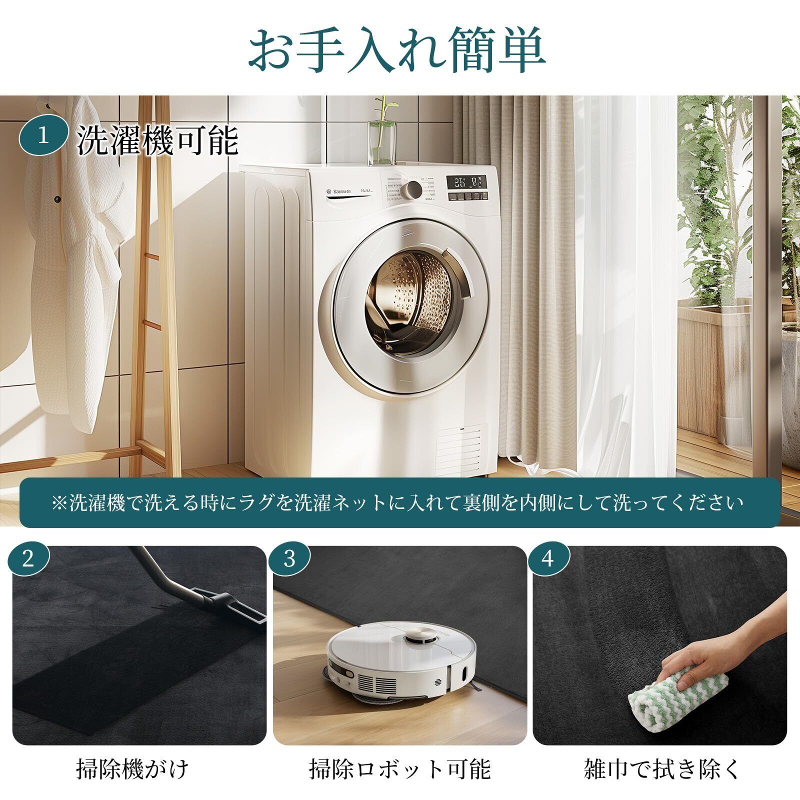 【軽量・お手入れ簡単】このカーペットは軽量設計で、移動や収納が簡単です。また、お手入れも楽々で、水洗いや洗濯機での洗濯(洗濯ネットの使用をお勧め)が可能。忙しい方にもぴったりの便利さです。毛足は掃除機をかけることができ、適度な長さで、ゴミやほこりが絡まりにくいです。