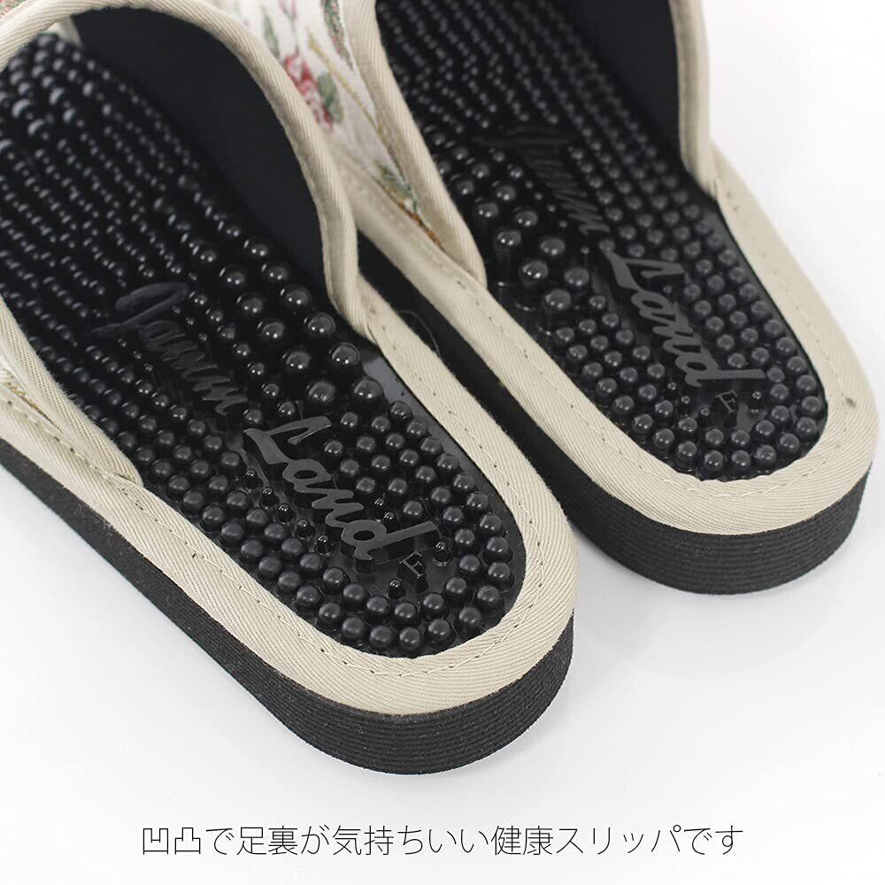安心の日本製なので、ギフトにも最適な健康スリッパです。 落ち着いたカラーに上品な薔薇柄のゴブラン織り。 足裏を程よく刺激してくれるので履いているだけで気持ちいいです。【サイズ】23〜24cm 幅約9cm ヒール約2.5cm 底:EVA 日本製