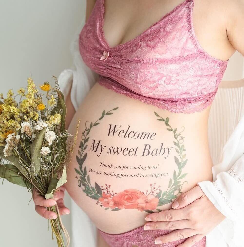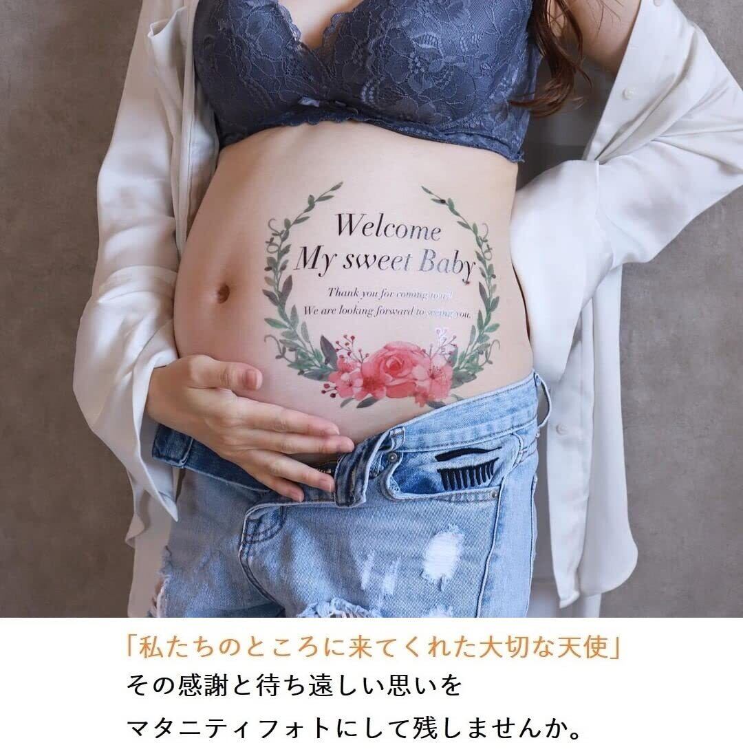 貼り付けに時間がかからず簡単にマタニティフォトが撮影できます。 落とすのも簡単で時間はかかりません。 ボディペイントよりも早く簡単に利用することができます。