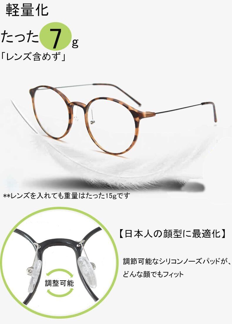 ★【日本人の顔型に最適化】調整可能のノーズパッド、小顔効果丸メガネ** 調節可能なシリコンノーズパッドが低鼻梁 幅広鼻にもフィット.7g超軽量フレーム設計と滑り止めテンプル先端でメイク崩れやパッド跡を大幅軽減、オンライン会議中もずれない安定感です.