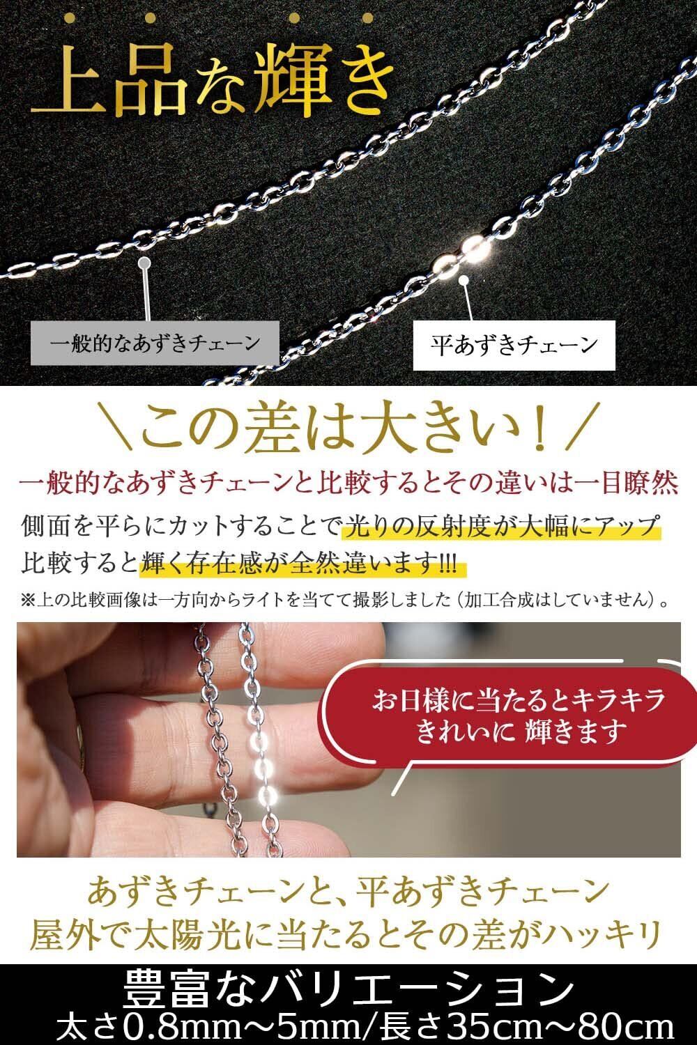 【キラキラ輝く平あずきチェーン】Napistの あずきネックレスチェーン は 上品に輝くワンランク上の平あずきチェーンを採用しています。あずきチェーンは各ピースの向きが交互に連なりますが、その各ピースが一般の丸型よりも両面を平らにカットしている平あずきの方が光を受けてキラキラと輝きます。またあずきチェーンは各ピースの隙間がほど良い抜け感を演出し派手過ぎずない上品さを醸しだしてくれます。トップを着けずチェーンだけでもおしゃれなチェーンです。