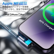 【ライトニングケーブル L字】従来のlightning ケーブルと異なり、90度に曲がって「l字型」となっているので、充電の時には、ゲームの操作や動画を見るのは邪魔されない、コンセントやパソコンに繋いでも、ケーブルを無理やりに曲げる必要がなしで、スマホを横向きにして充電したり、ゲームしたり、スタンドやカバンに置いても便利になります。