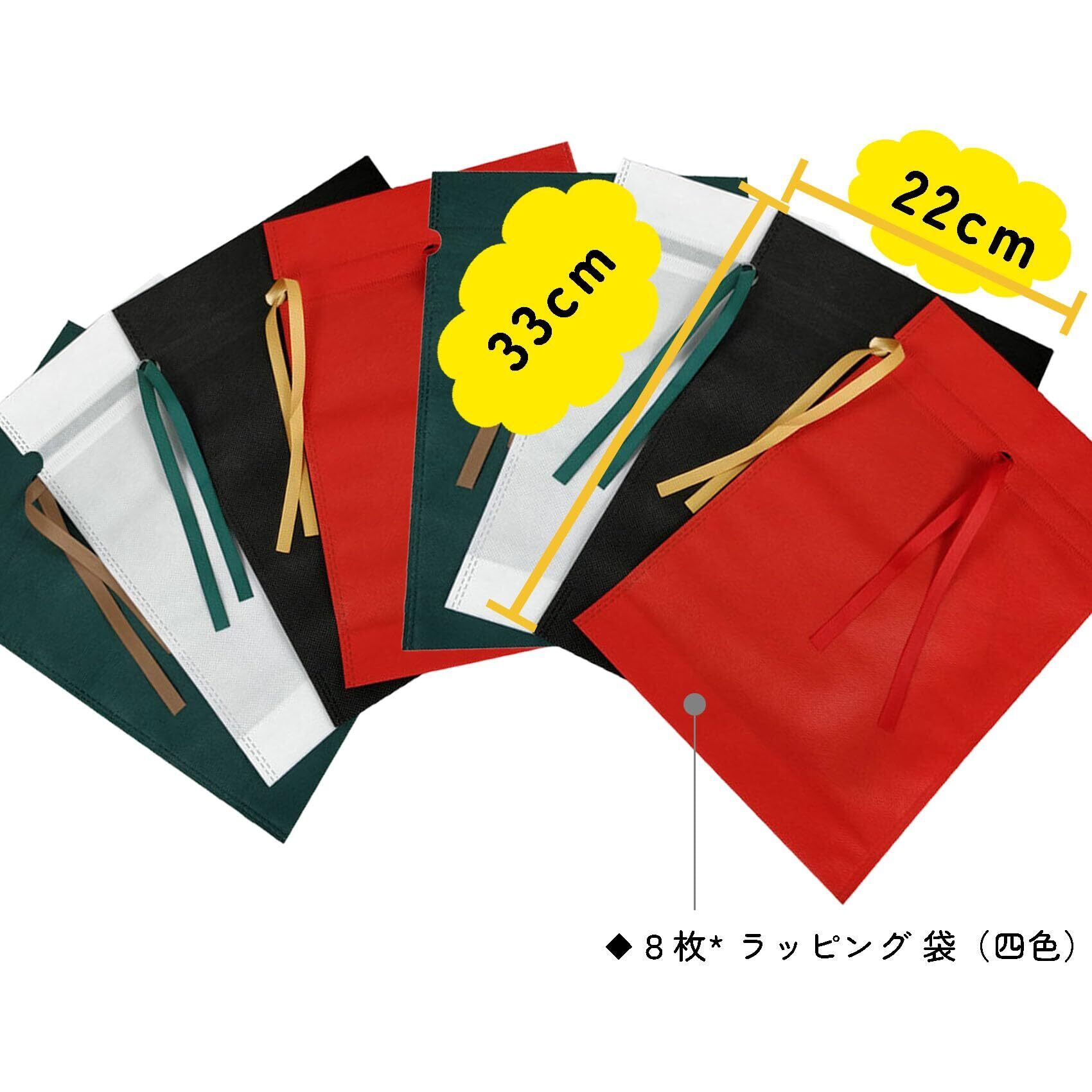 ??【 四色8枚セット!贈り物に最適!】8枚不織布 ラッピング 袋(赤、緑、白、黒各2枚)!様々な用途に使える。お菓子や小物などちょっとした贈り物や、バレンタイン、誕生日、クリスマス、父の日、母の日などのちょっとした贈り物の際に手元にあると役立ちます。雑貨店、フリマのショップ袋としても使えますし、結婚披露宴、出産祝い、学校の卒園式などの行事にも。ハンドメイド品のパッケージ品としてもおすすめです。
