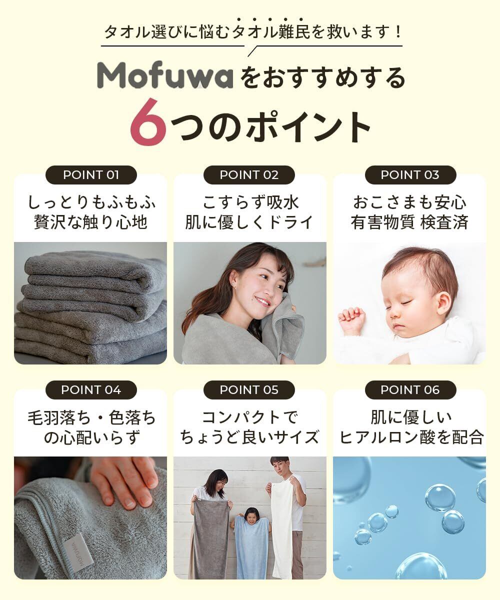 ??Mofuwaバスタオルセットは、柔らかくて心地の良さに焦点を当てたバスタオルです。 厳選した柔らかい生地(Cloud Touch)のみを使い、コンパクトながらも最高の快適さを提供します。 新しい生活のスタートやプレゼントにも最適です。 Mofuwaはあなたの毎日に豊かなバスタイムをもたらします。