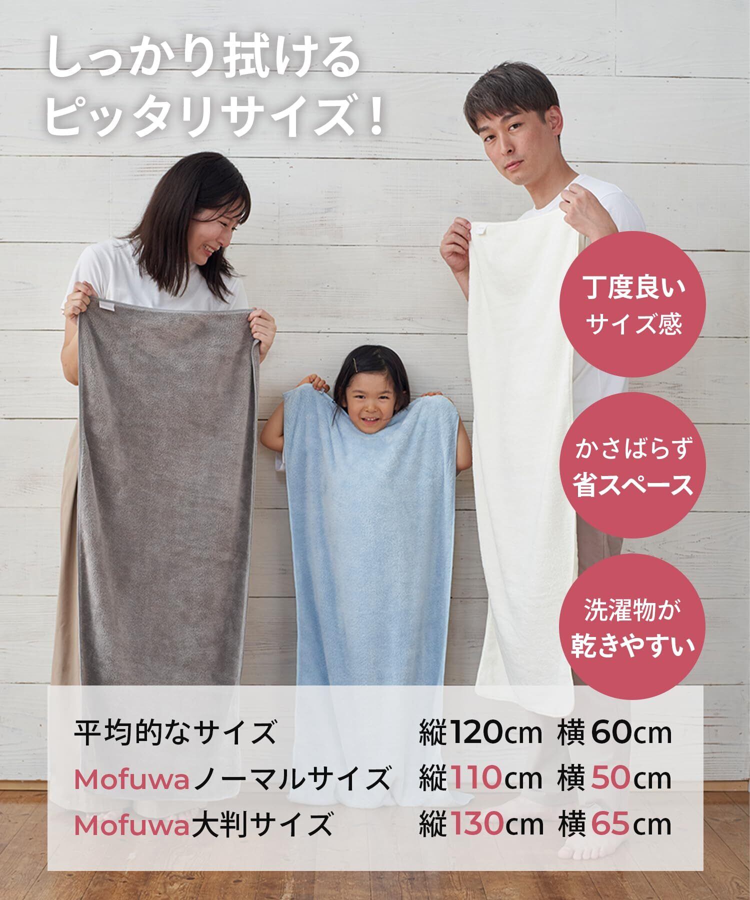 ??コンパクトサイズで効率的 Mofuwaバスタオルは110cm x 50cmのコンパクトサイズですが、吸水性が高く、体全体をしっかりお拭き頂けます。コンパクトなのでかさばらないのも特徴です。