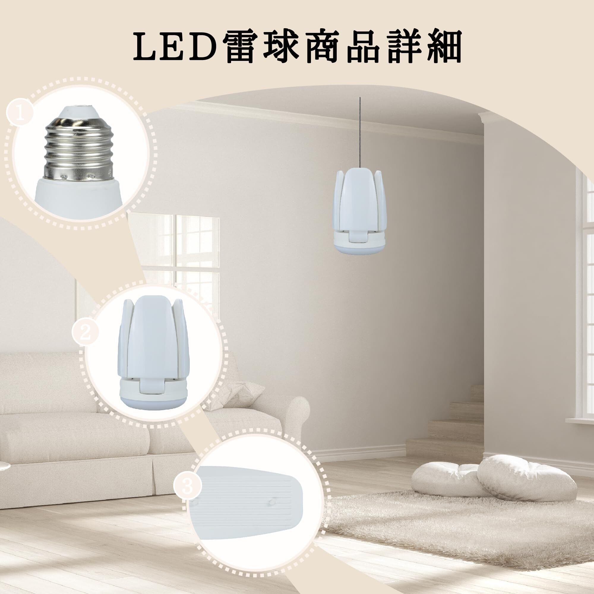 【開閉式照射】開閉式照射機能を備えています。これにより、前面照射と全方向照射の両方を実現することができます。電球の先端部分を開くと、前方に照射されます。電球を閉じると、光が全方向に拡散されます。このような機能を持つことで、様々な照明ニーズに対応できます。例えば、読書時には前面照射で照らし、一方で、一室全体を均一に照らしたい場合には全方向照射にすることができます。
