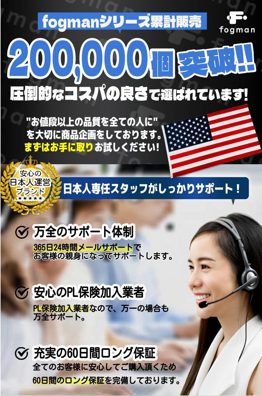 【安心の60日間返品返金】fogmanブランドより、迅速にお客様の元へお届けいたします。また本製品は購入から60日間の返品付き、万が一の際に備えてPL保険加入しております。商標登録第6354569号