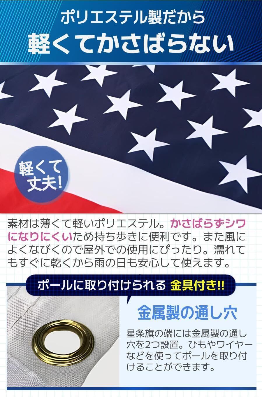 【金属製の通し穴】星条旗の端には金属製の通し穴を2つ設置。ひもやワイヤーなどを使ってポールを取り付けることができます。