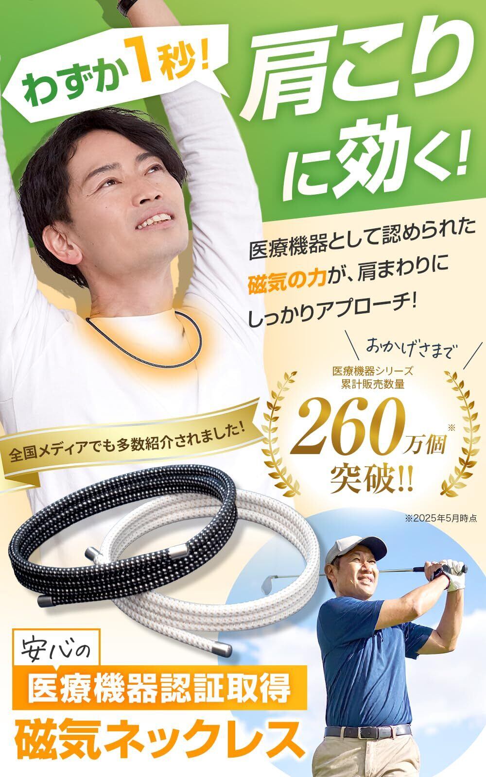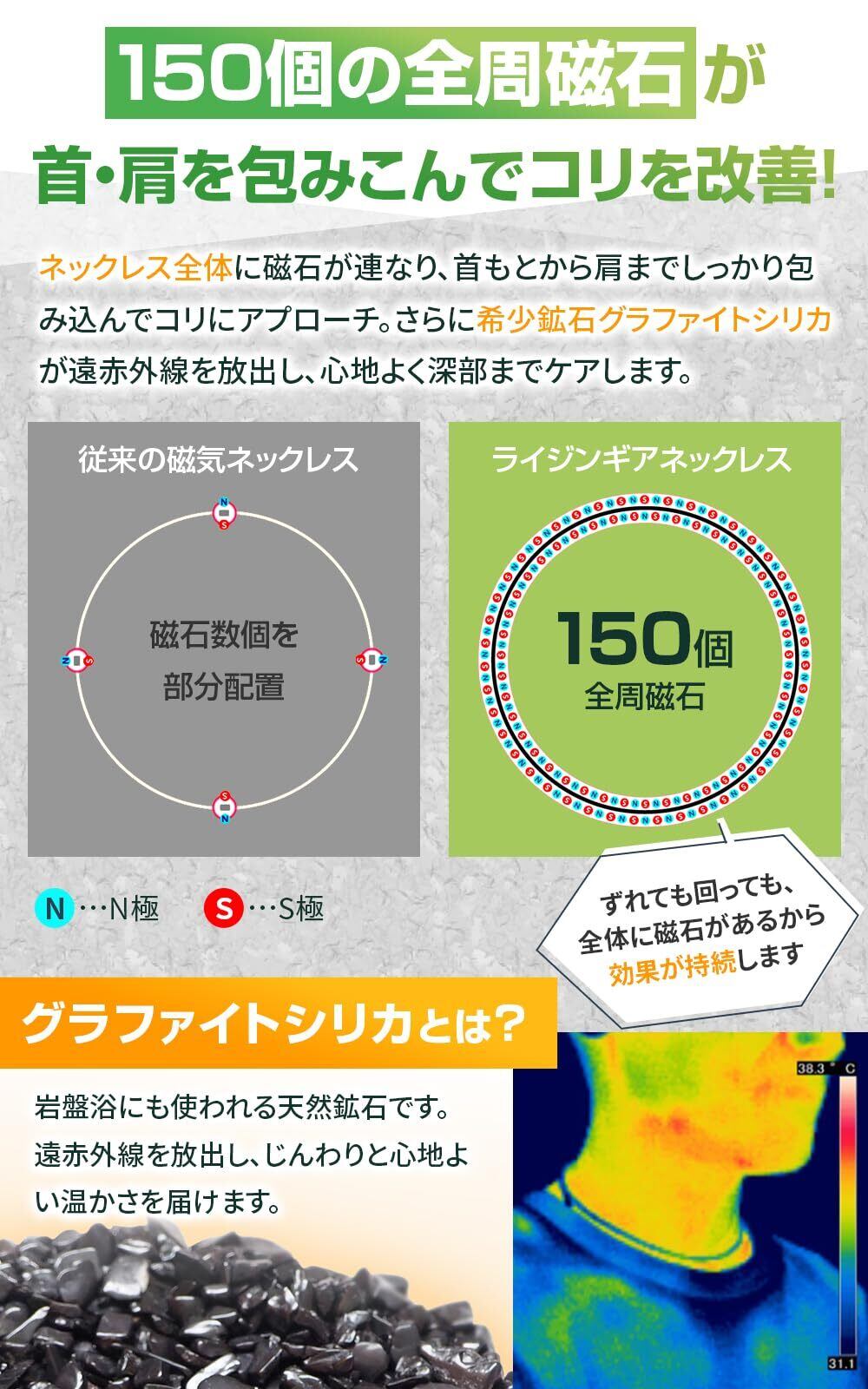 ? 強力な磁気でコリを緩和 ライジンギアネックレスは、首や肩のコリに悩む方々に向けて開発された、スタイリッシュな磁気ネックレスです。ライジンギアネックレスは、150mT(ミリテスラ)のネオジム磁石を150個も使用し、首や肩周辺に均等に配置しています。150個のネオジム磁石が360度全方位から血行を促進し、コリの改善に効果を発揮します。この強力な磁気が血行を促進し、慢性的なコリを効果的に緩和します。医療機器認証(医療機器認証番号 303AGBZX00002000)を取得しており、その効果と安全性がされています。日々の生活で感じる不快なコリから解放され、快適な毎日をサポートします。