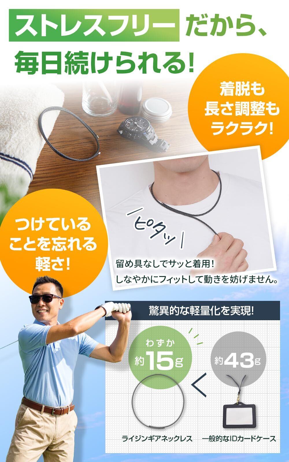 ? 軽量で快適な装着感 重さ約15gと非常に軽量なライジンギアネックレスは、長時間の装着でも負担を感じさせません。全長60cmのフリーサイズ設計で、首の太さや服装に合わせて自由に調整可能です。また、留め具のないマグネット式構造により、片手で簡単に着脱できます。これにより、忙しい日常でも手間をかけずに使用でき、快適な装着感を提供します。