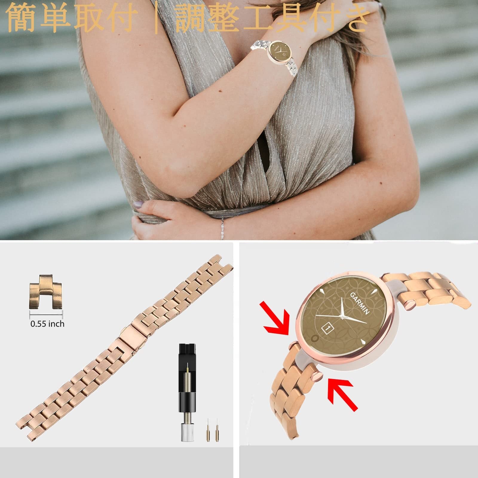 【簡単取付|調整工具付き】調節工具付きで自分でGarmin Lily Watchの長さを腕によって調節して、余分なチェーンを取り外すことができます。また、バンドの着脱はとても簡単です。