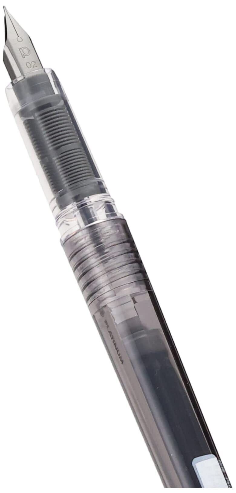 ピカピカに磨かれたステンレス材で摩耗に強い特殊合金ポイント付のペン先は、1,000 円以下の万年筆では最高の品質を誇る。