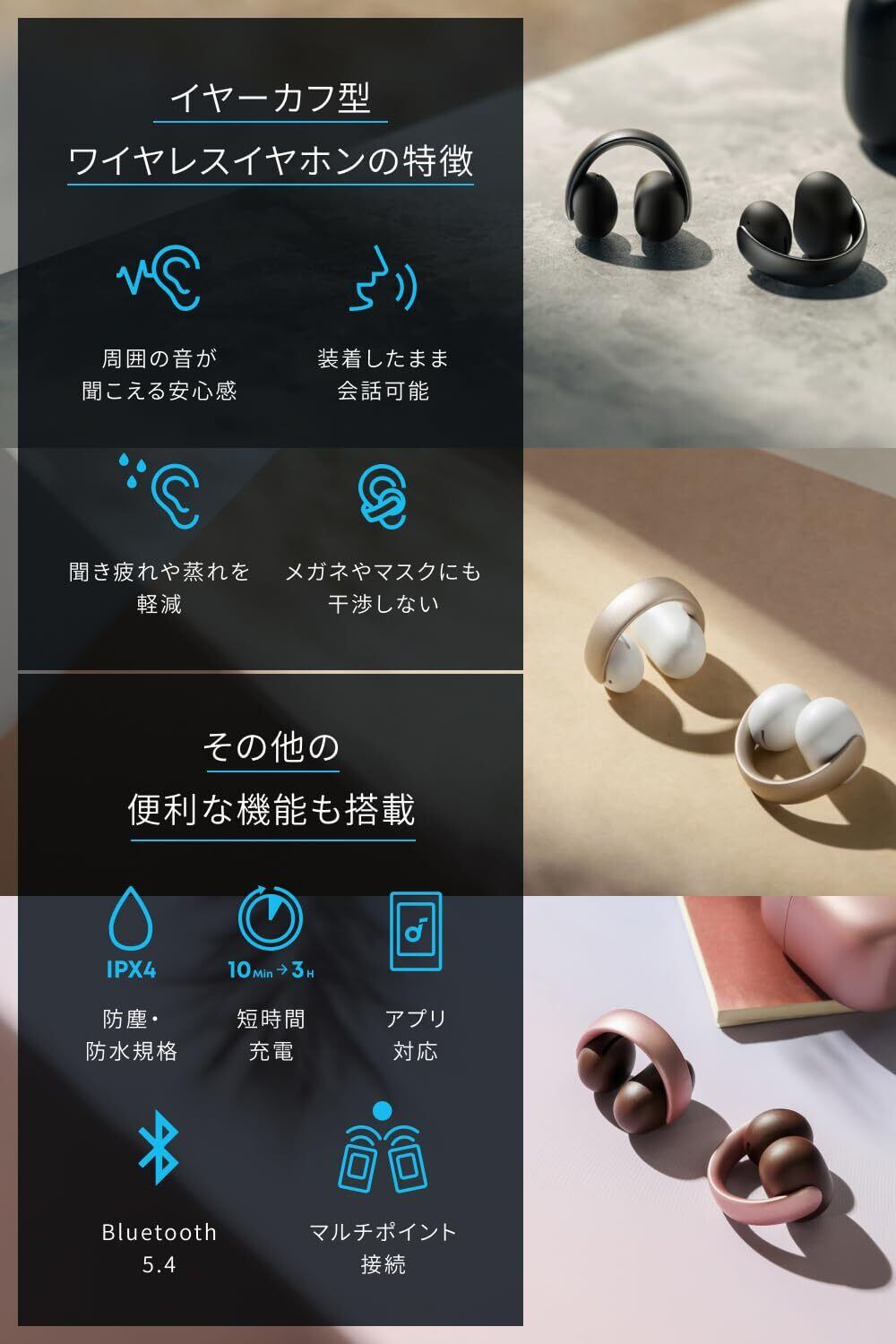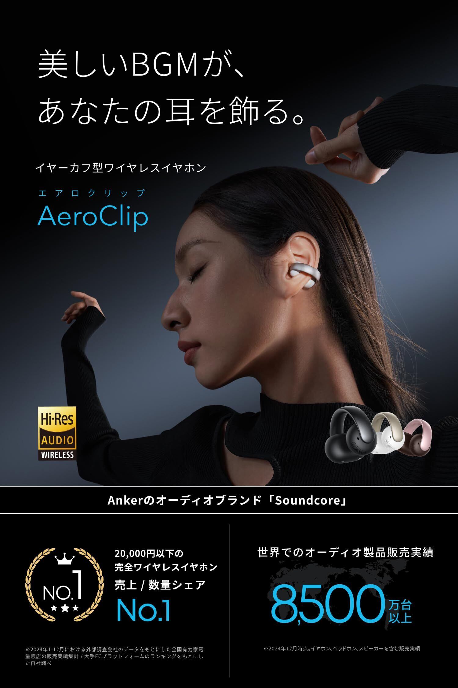 Anker Soundcore AeroClip(Bluetooth 5.4)【オープンイヤー型ワイヤレスイヤホン/イヤーカフ/ IPX4防水規格/ 最大32時間再生 / マルチポイント接続】ミッドナイトブラック