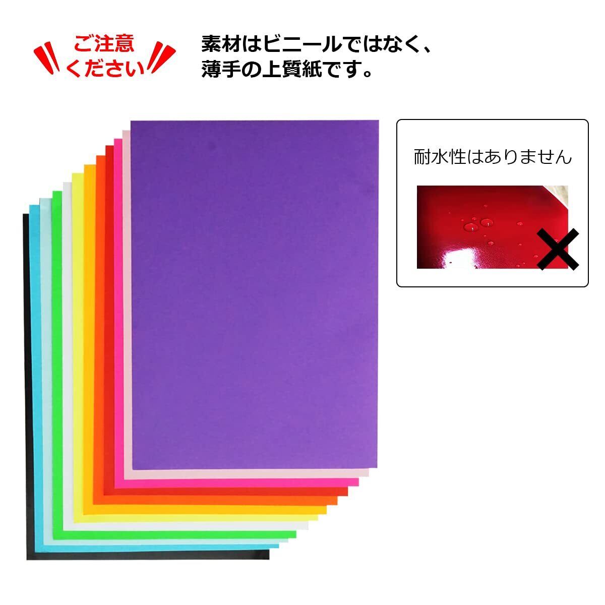 【仕様】 サイズ:A4(210×297mm) マット上質紙(黒のみ光沢紙) 背面シール仕様 カラー:黒・白・赤・蛍光ピンク・蛍光黄色・蛍光黄緑・蛍光レッドオレンジ・オレンジ・ピンク・水色・青・紫 各1枚 (12色) ※耐水性はありません。