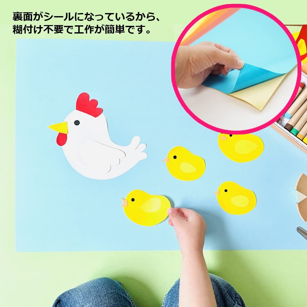 【糊つきで工作に便利】 裏面がシールになった、薄手のカラー上質紙です。ノーカットなので、自由な形に切り取っていただけます。ハサミやカッターで切り取りやすく、糊付けの手間がないので工作が簡単です。