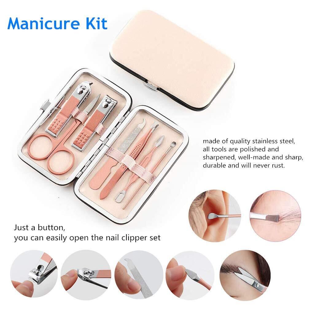 【7in1マニキュアセット】:RuiChyローズゴールドマニキュアキットには、爪切り、斜めの爪切り、眉毛はさみ、眉毛ピンセット、耳かき、爪やすり、ダブルヘッドピックが含まれています。ハンドケア、フェイシャルケア、フットケアを含め、あなたのニーズを満たすことができます。