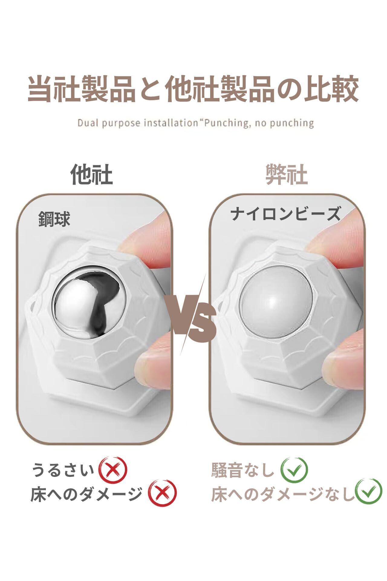 【製品特長】 このキャスターは硬質ナイロン製車輪を使用しており、360度スムーズに動作します。そのため、木造の床に傷をつける心配はありません。本体はABS樹脂で作られており、耐久性に優れています。また、アクリル両面テープとネジで取り付けるため、取り外しや取り付けが簡単です。