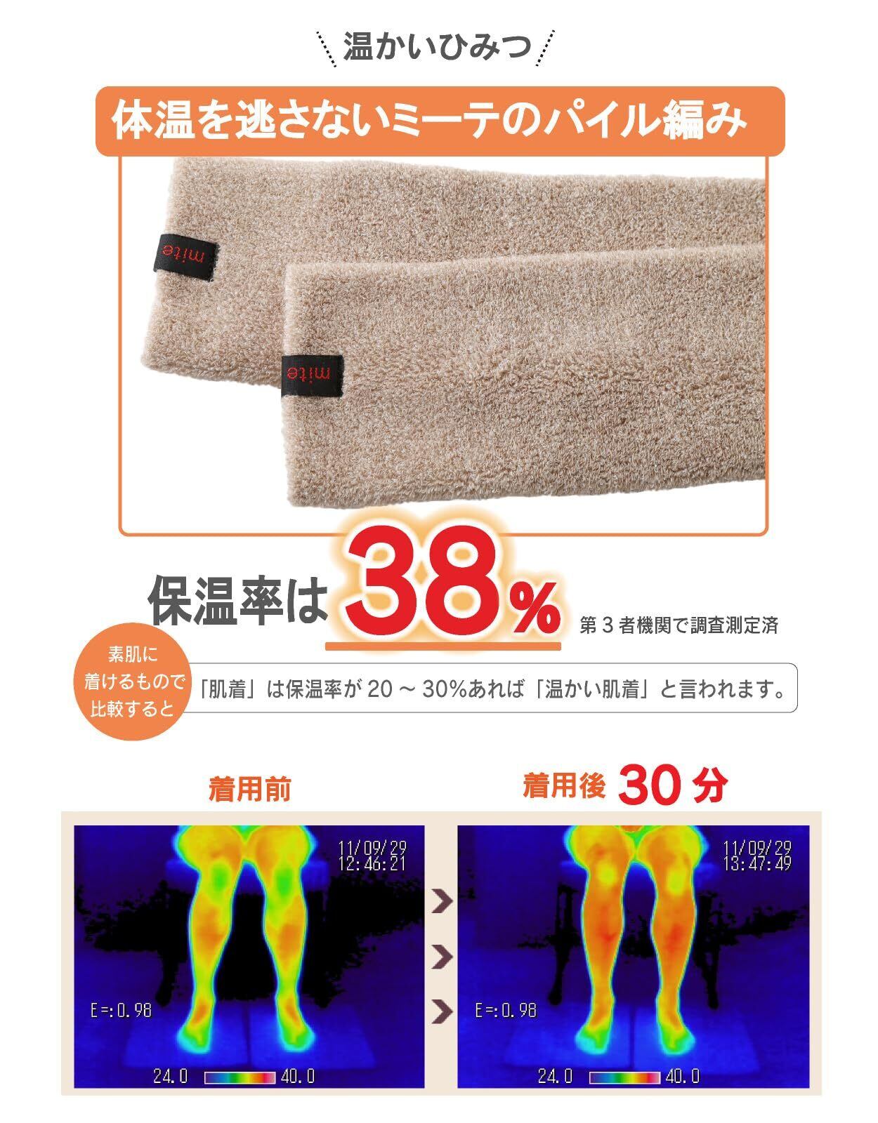 【高い保温性と保温率】ミーテの保温率は38%。肌着は保温率が20〜30%あれば温かい肌着と言われます。お風呂上がりの後に汗をよく拭きふくらはぎをミーテで保温してください。
