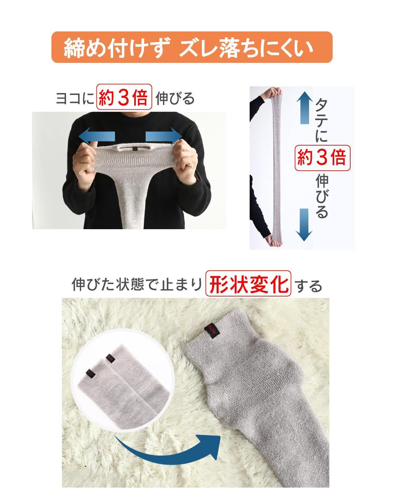 【締め付けない 独自製法】タテに引っ張らず、ヨコに広げながら、くるぶしからひざ下まで履きます。着用するとふくらはぎの大きさまで広がり、その状態をキープして元に戻りません。ぴったりフィットするのにふくらはぎを圧迫しないので、就寝中も安心して使用できます。