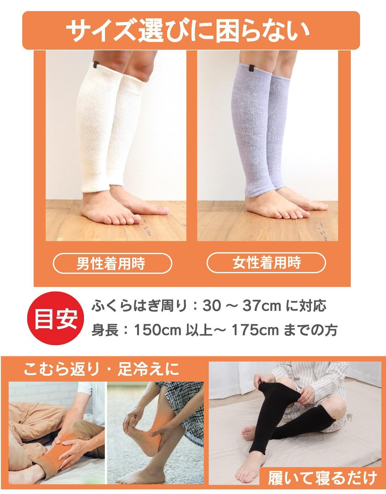 【生産国】日本【数量】1足(2本入り)【サイズ】M〜L ふくらはぎ周り(一番太いところ)30cm〜37cmに対応(男女兼用)身長155cm未満の方にはライト35がおすすめ 【長さ】40cm 幅:8cm【素材】綿69%、アクリル15%、ポリエステル14%、ポリウレタン2%【カラー】ブラック、ベージュ、グレージュ、サーモンピンク、オレンジ、オフホワイト、パープル