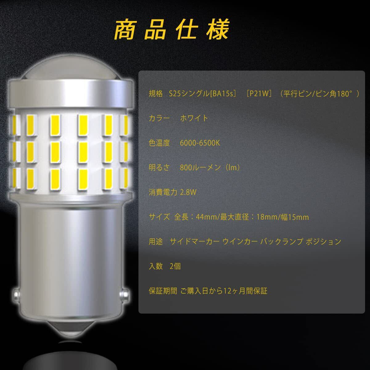 【仕様】S25 LEDシングル球 ホワイト (BA15S P21W G18)は、3014チップを搭載、消費電力は3.2w、色温度は6000K-6500K、動作温度環境は-35℃~+75℃で、航空アルミ製、パッケージは2個入りです。